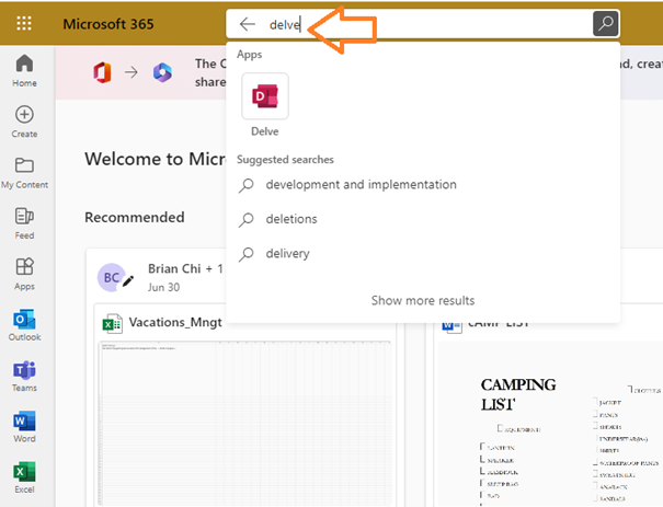 2. In the search box type in Delve and click on the Delve App that results.