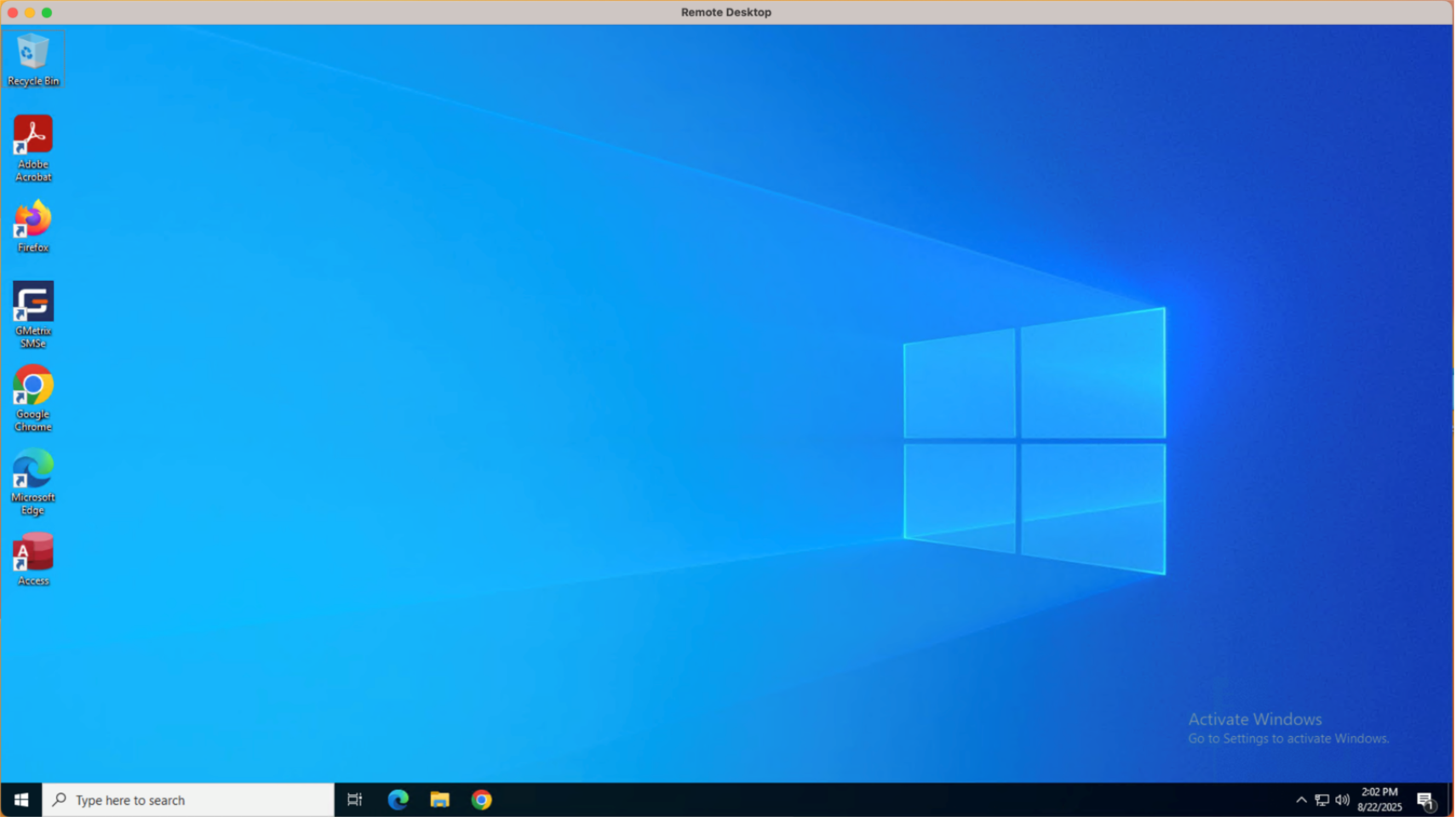 - Once the connection is established, you will be at the Desktop on the Remote Desktop Server. You may use the installed applications as you wish. Please keep in mind that this Remote Desktop Server does not allow file transfer to your physical computer. You will need to e-mail any work to yourself or upload directly to Canvas. Ask your instructor if you have any questions regarding turning in your work. *Please disregard the Activate Windows warning at the bottom of the screen.