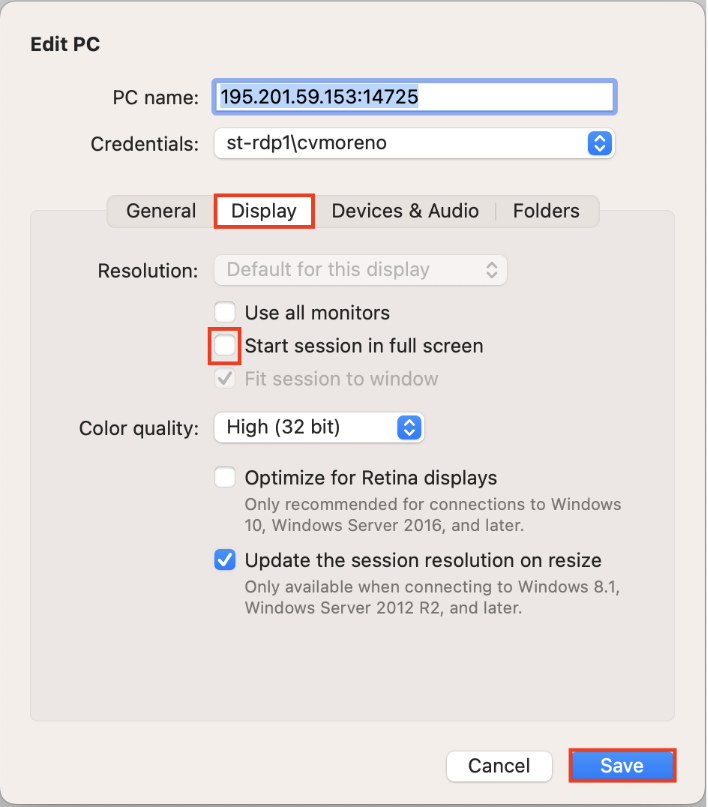 By default, the Windows App will open Remote Desktop connections in Full Screen mode. Follow this optional instruction to have the Remote Desktop Server open in a smaller window. At the devices window, right-click the connection that you added. Click on Display. Uncheck Start session in full screen and click Save.