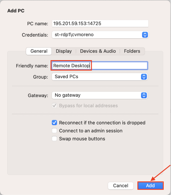 Once you have added your credentials, you will be back at the Add PC Window. You are able to give your connection a Friendly Name. For this example, I used Remote Desktop. Click Add at the bottom right-hand corner of the window.