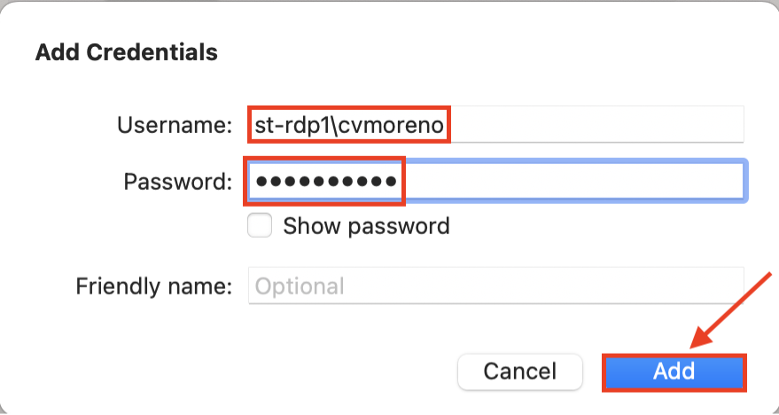 At this window, you will enter your username and password. Your username will be the same as your MyCom username. Please remember to type in st-rdp1\ before your username. DO NOT ADD A SPACE AFTER st-rdp1\. Your password will be provided by your instructor. After adding your username and password, click Add.