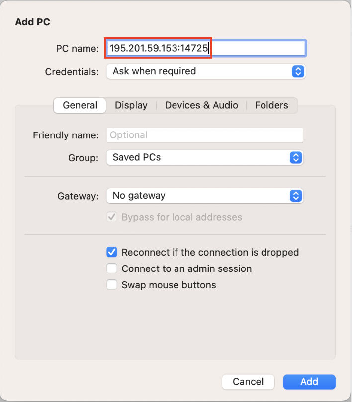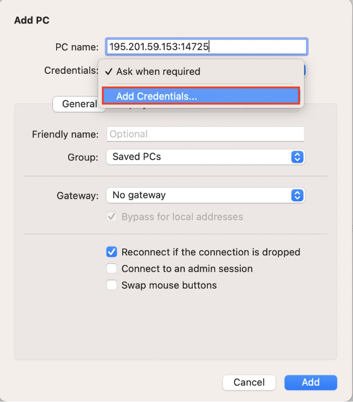 The Add PC window will pop up. Enter the following IP Address for the computer name: 195.201.59.153:14725