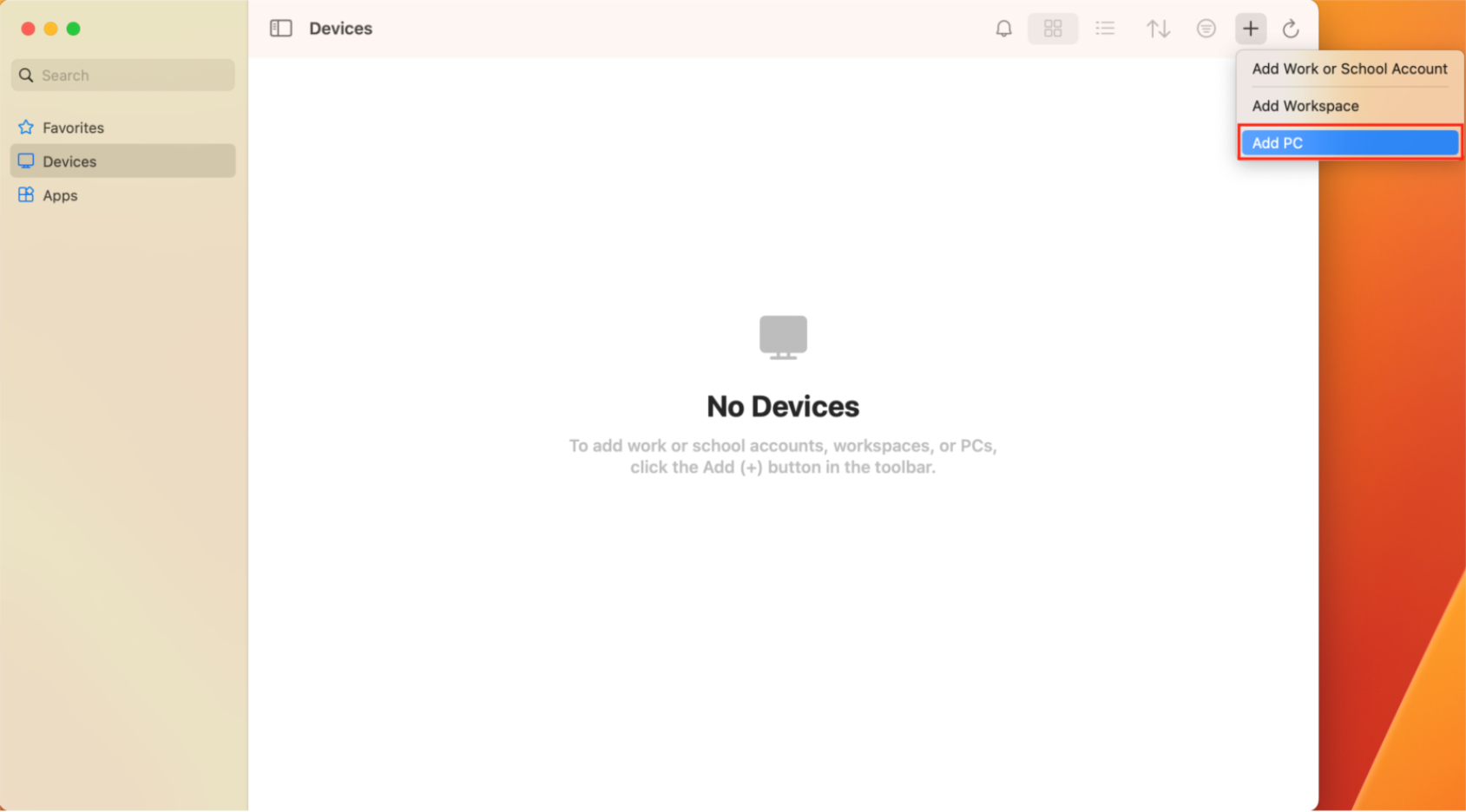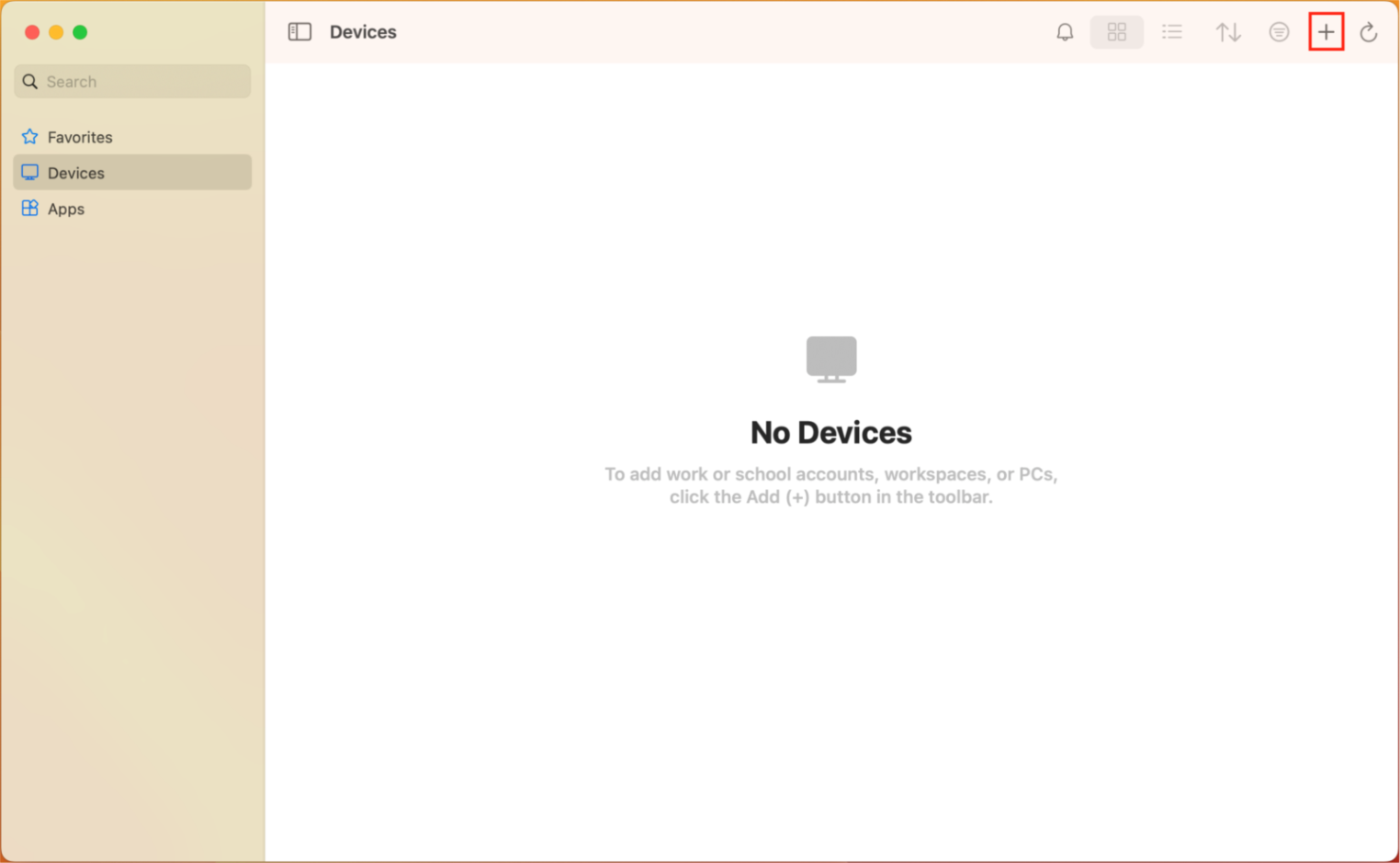 After clicking Skip, you will be at the following window. Click on the + at the top right-hand corner of the window to add a Remote Desktop Connection.