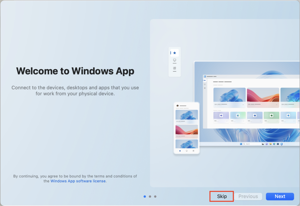 After you click OK, the Windows App will open. Click Skip on the bottom right-hand corner of the window.