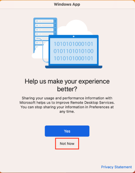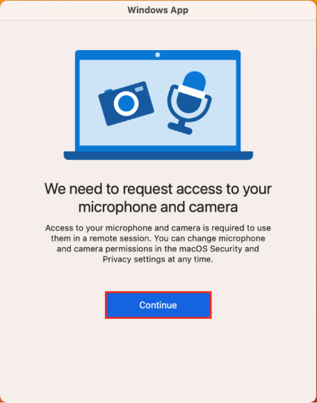 At this window, the Windows App is asking for permission to access your microphone and camera. Click Continue.
