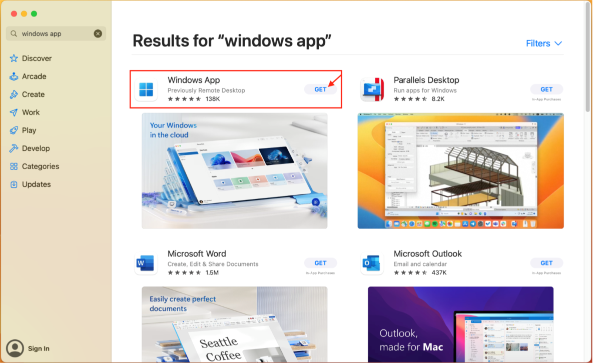 The correct application will be the same as the screenshot below. This application is free and will not cost any money. In Windows App, click GET.
